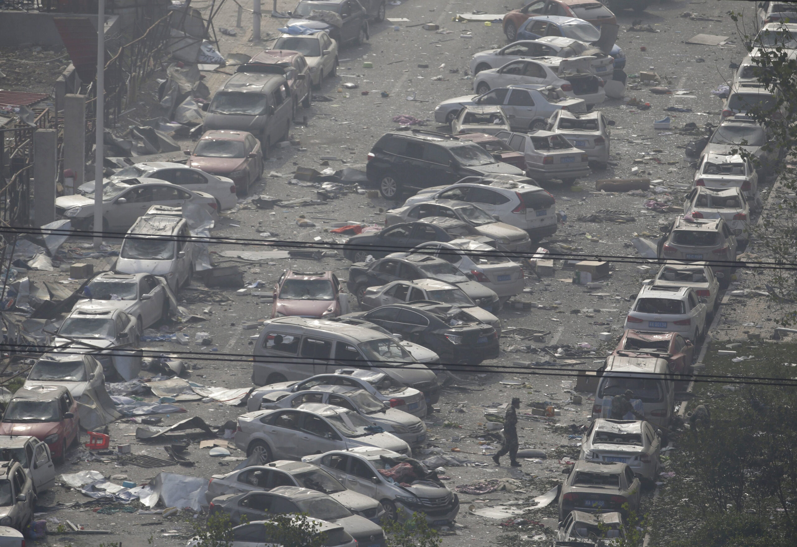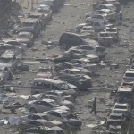 August 15, 2015 — Wearing gas masks and protective clothing, paramilitary police officers in Tianjin, China search for survivors while assessing the damage after two chemical explosions kill 104 people and causing millions of dollars in damage. Earlier today, a 40 year-old man was rescued from a collapsed building by workers wearing masks and hazmat suits. So far, 6,300 people have been displaced, says the Chinese state controlled media. For the city of 15 million people, the biggest concern is the real of sodium cyanide into the air and water sources.